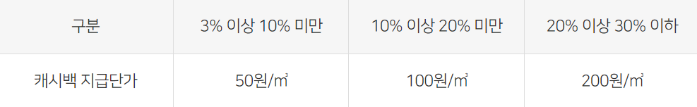 전년 동기간 대비 3%이상 절감시 절감율별 차등 지급하게 되는데 젊감율이 높을수록 캐시백 지급 단가가 높아집니다. 3%이상 10%미만 절감하게 되면 세제곱미터당 50원이, 10%이상 15%미만 절감시 세제곱미터당 100원이 15%이상 30%이하 절감시 세제곱미터당 200원을 캐시백 해줍니다.